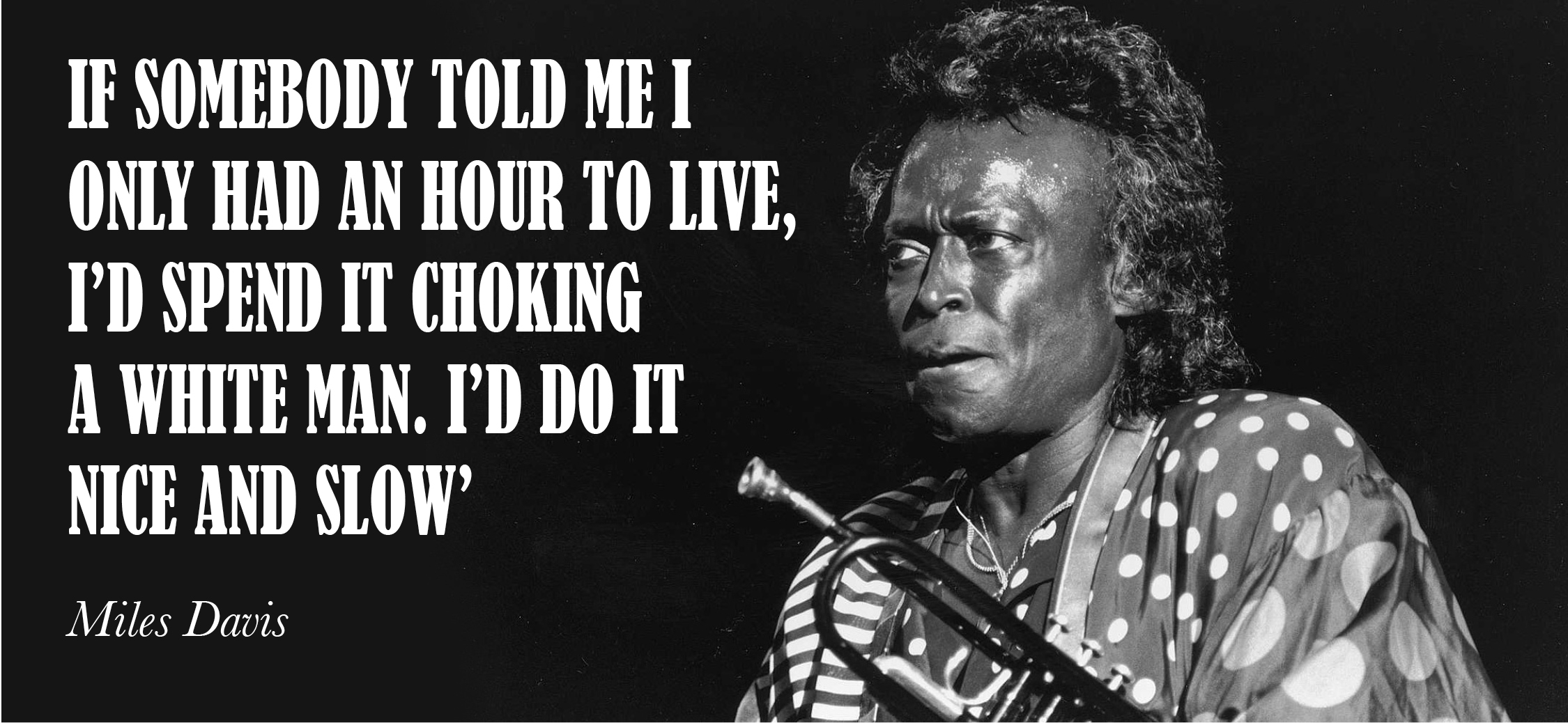 There was a time when songs about racism by black people were all about how black people were marginalised and why can’t we get along of the Hot Chocolate Louie Louie variety. But then hip-hop happened. ‘Kill whitey,’ urged Menace Clan. ‘Kill the white people,’ explained Apache. ‘I like to fill them full of holes,’ admitted Brand Nubian. The rap sheet of racism is long and violent. They all justify their anti-white stance as a reaction to racism, spearheaded by Jazz hero Miles Davis, who blamed his ‘bitter and cynical’ attitude towards whites on being beaten by cops, admitting the loathing went all the way back: ‘About the first thing I can remember as a little boy was a white man running me down the street hollering, ‘Nigger! Nigger!” Justified? Arguably. Racist? Definitely.